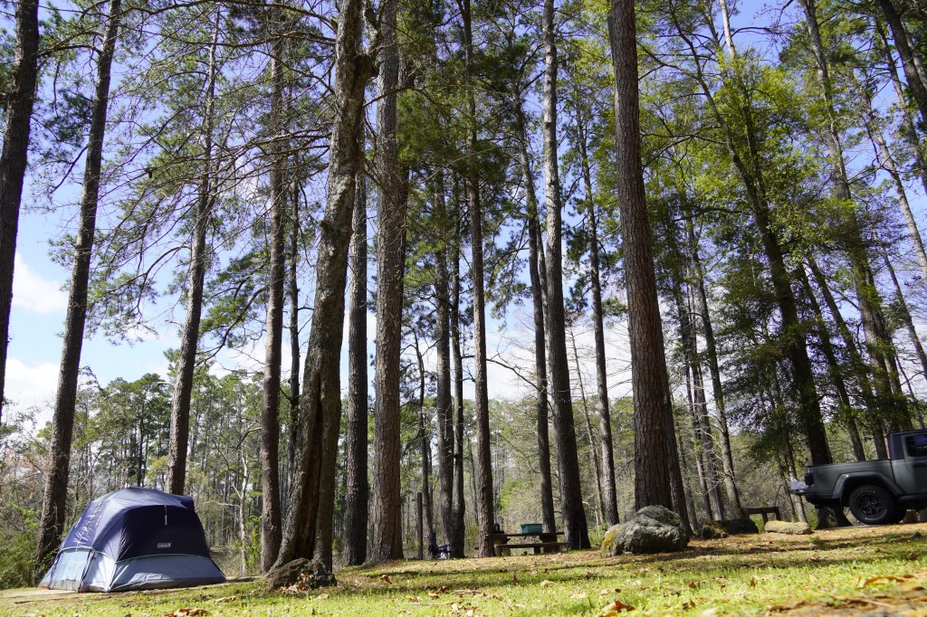 As we roll into Ratcliff Lake Recreation Area in our trusty Jeep Gladiator, anticipation fills the air. Stepping out of the vehicle, we’re greeted by the serene beauty of a 45-acre lake, once a bustling log pond in the early 20th century. Surrounded by towering pines, the landscape exudes a sense of timeless tranquility that belies its Texas roots. With ample space between neighbors and our own fishing bank, we feel truly immersed in the peaceful serenity of the forest.